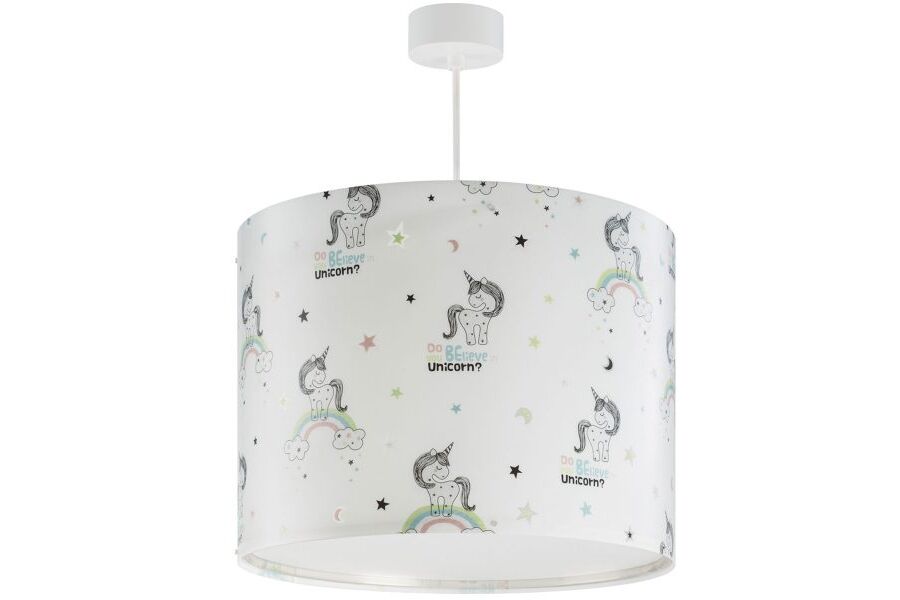 Κρεμαστό φωτιστικό οροφής με θέμα τους μονόκερους και κατάλληλο για γενικό φωτισμό. Συνθετικό υλικό αντοχής πολυπροπυλενίου και εκτύπωση με glitter σε εξωτερικά μέρη. Κιτ ανάρτησης ρυθμιζόμενο στο ύψος κατά την εγκατάσταση. Παρέχεται διαχυτής φωτός για ομοιόμορφο φωτισμό. Τροφοδοσία ρεύματος: Εύρος 220 V – 240 V. Τύπος ντουί: E27 και θέση για έναν λαμπτήρα. Διαστάσεις: Ύψος: 25εκ. – Διάμετρος: ∅33εκ. Κατασκευασμένο εξ ολοκλήρου στην Ευρώπη. Το Unicorns κρεμαστό φωτιστικό οροφής συμπληρώνει τα υπόλοιπα φωτιστικά της συλλογής.